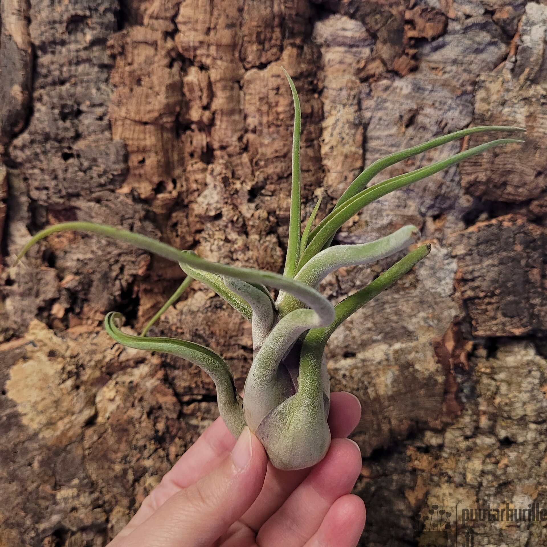 Komea mukulamaisen lehtiruusukkeen muodostava tillandsia. Todennäköisesti T. caput-medusae Lehtien pituus n. 15 cm suoristamatta. Sopiva kasteluväli on yleensä n. 1-2 viikon välein joko upottamalla tai sumuttamalla - mitä viileämpää on, sitä harvemmin kastelua tarvitaan. Huolehdi, että lehtiruusukkeeseen ei jää vettä seisomaan kastelun jälkeen, vaan kuivata kasvia esim. ylösalaisin, jotta vesi valuu pois. Mukulamaisia ilmakasveja ei kannata kastella laisinkaan tyvelle, vaan vain lehtiä.
