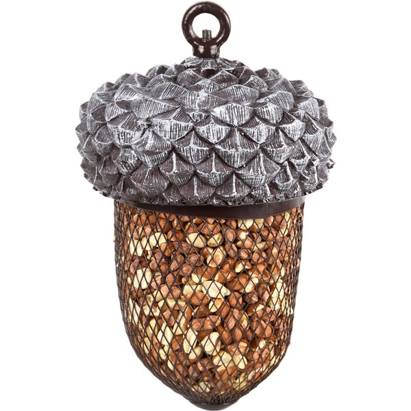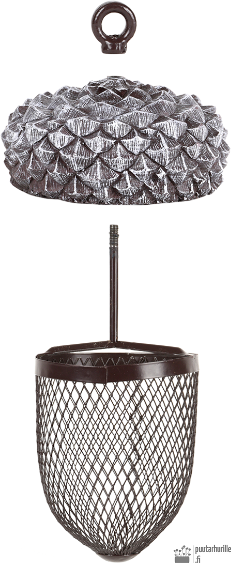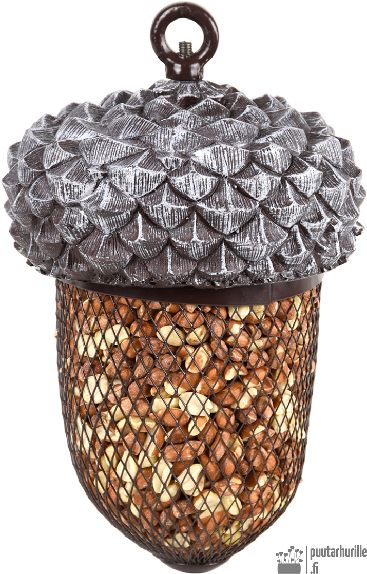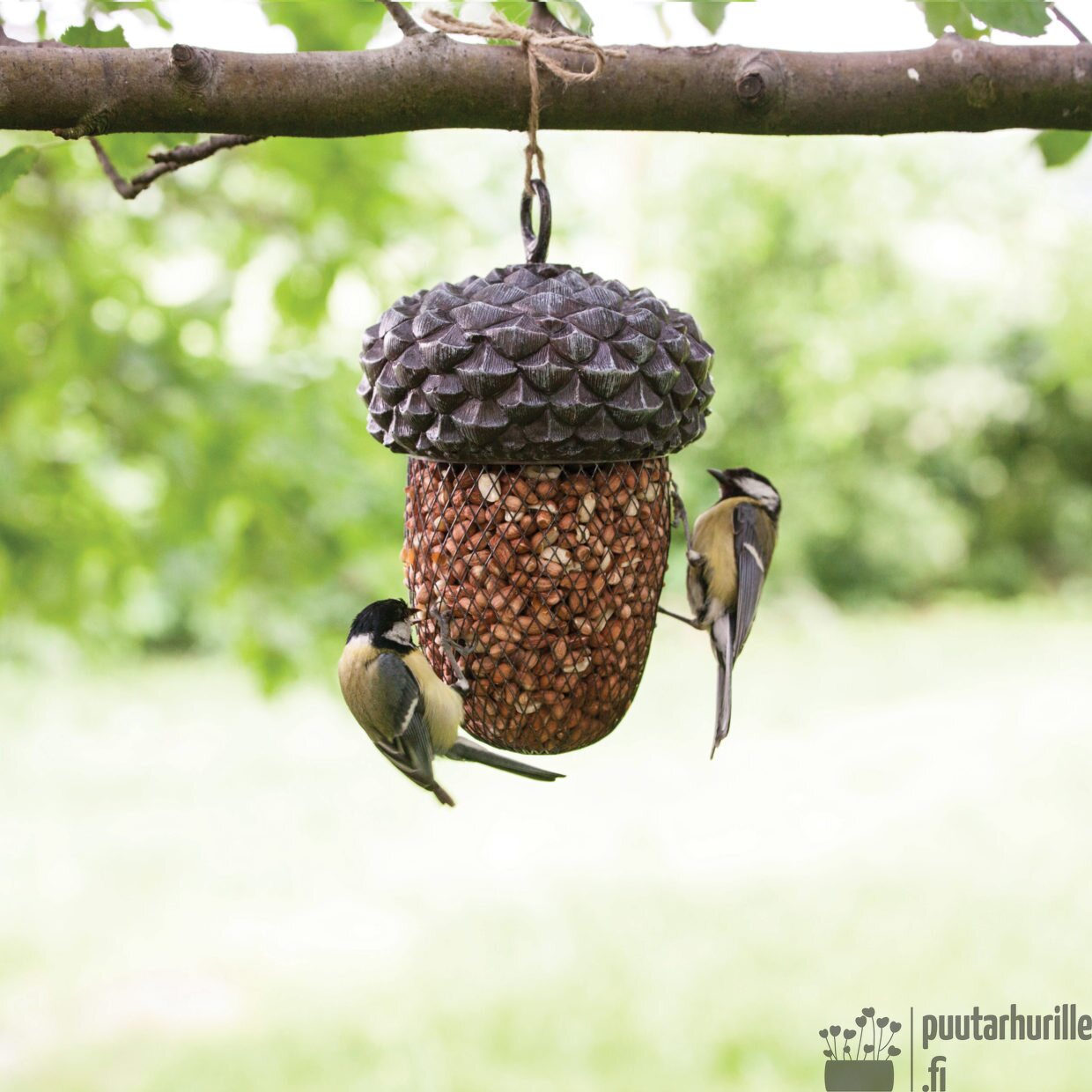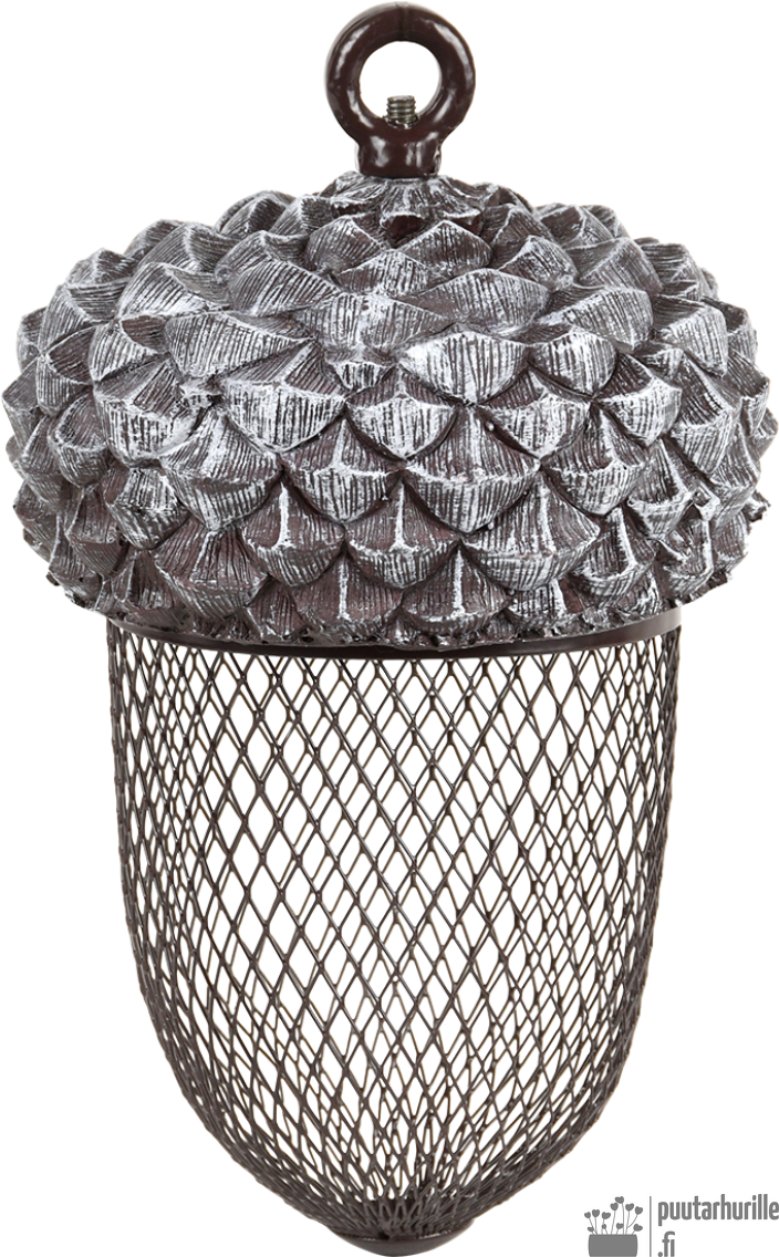 Söötti tammenterhon muotoinen lintulauta, johon voi laittaa esim. auringonkukansiemeniä tai kokonaisia tai karkeaksi rouhittuja maapähkinöitä. Verkon silmäkoko on n. 0,5x0,7 cm, joten muutkin karkeammat siemenet, pähkinät tai kuivatut marjat toimivat lintulaudassa.